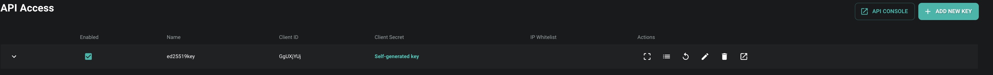 You can also create an asymmetric API key programmatically using theprivate/create_api_key method. Note: You’ll need to authenticate with an existing API key to use this method.