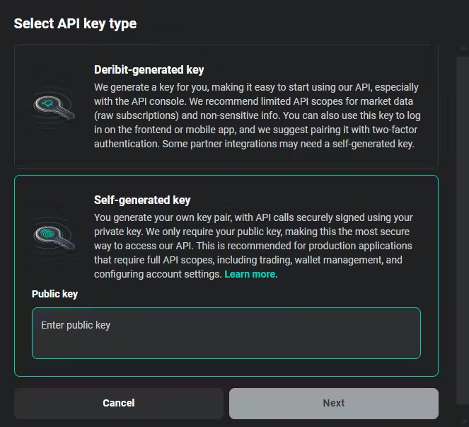 After generating your key pair, you need to register your public key with Deribit to create an API key. You can do this either through the web interface or via the API. What you’ll need:- Your public key (the contents of