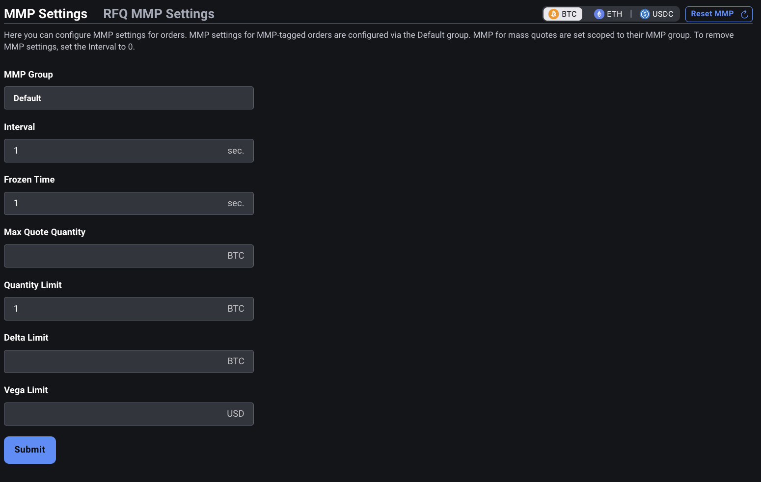 Block RFQ MMPMMP can also be configured for Block RFQ quoting. The configuration process for Block RFQ MMP is described in the Deribit Block RFQ API walkthrough article.